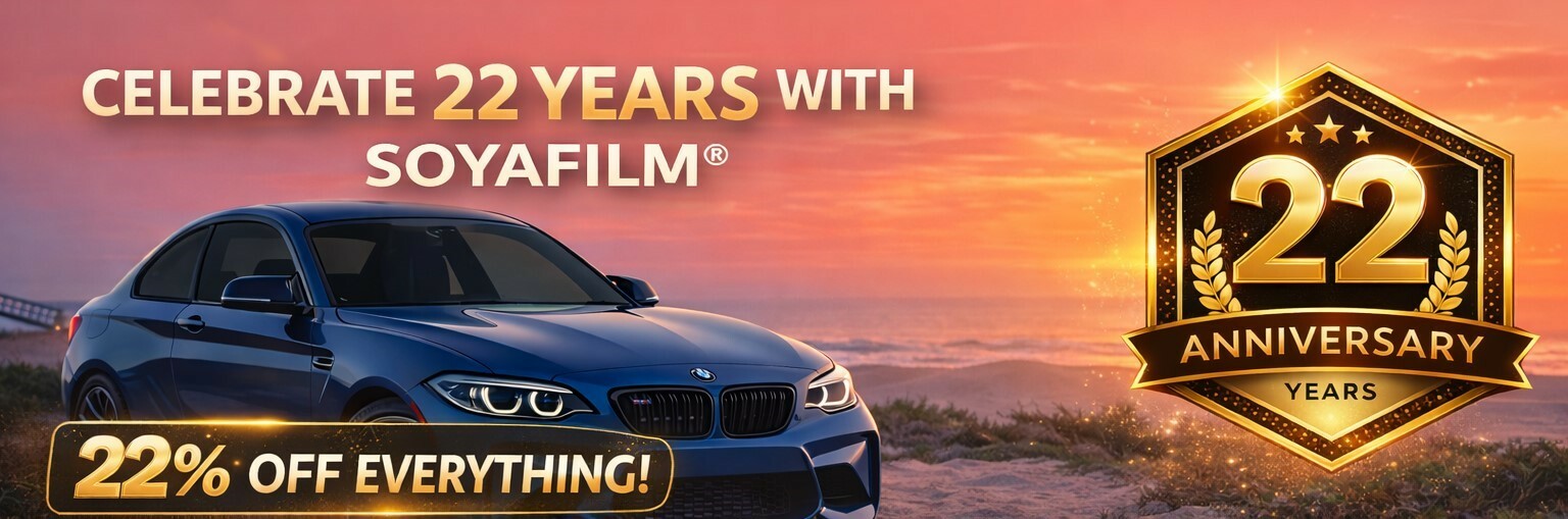 SOYAFILM® - Originalet. Avtagbar, återmonterbar unik solfilm utan klister monteras enkelt på alla bilar, då filmen är mjuk så följer den glasets form även när det är extremt böjt. Kan monteras av och på hur mycket du vill.